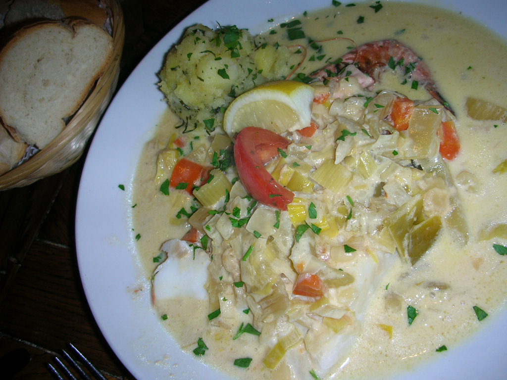 魚介類と野菜をクリームシチュー風に煮込んだもの。