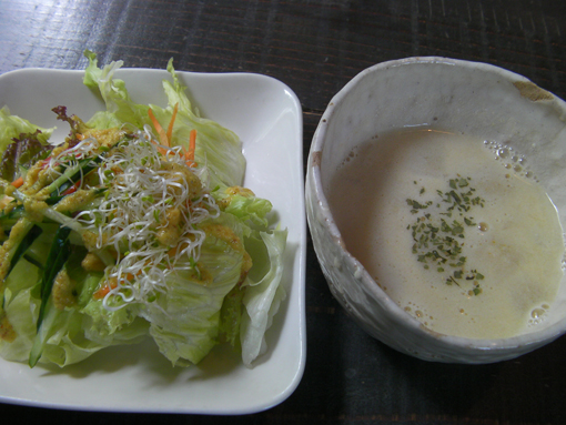 ランチの豆乳スープとサラダ。